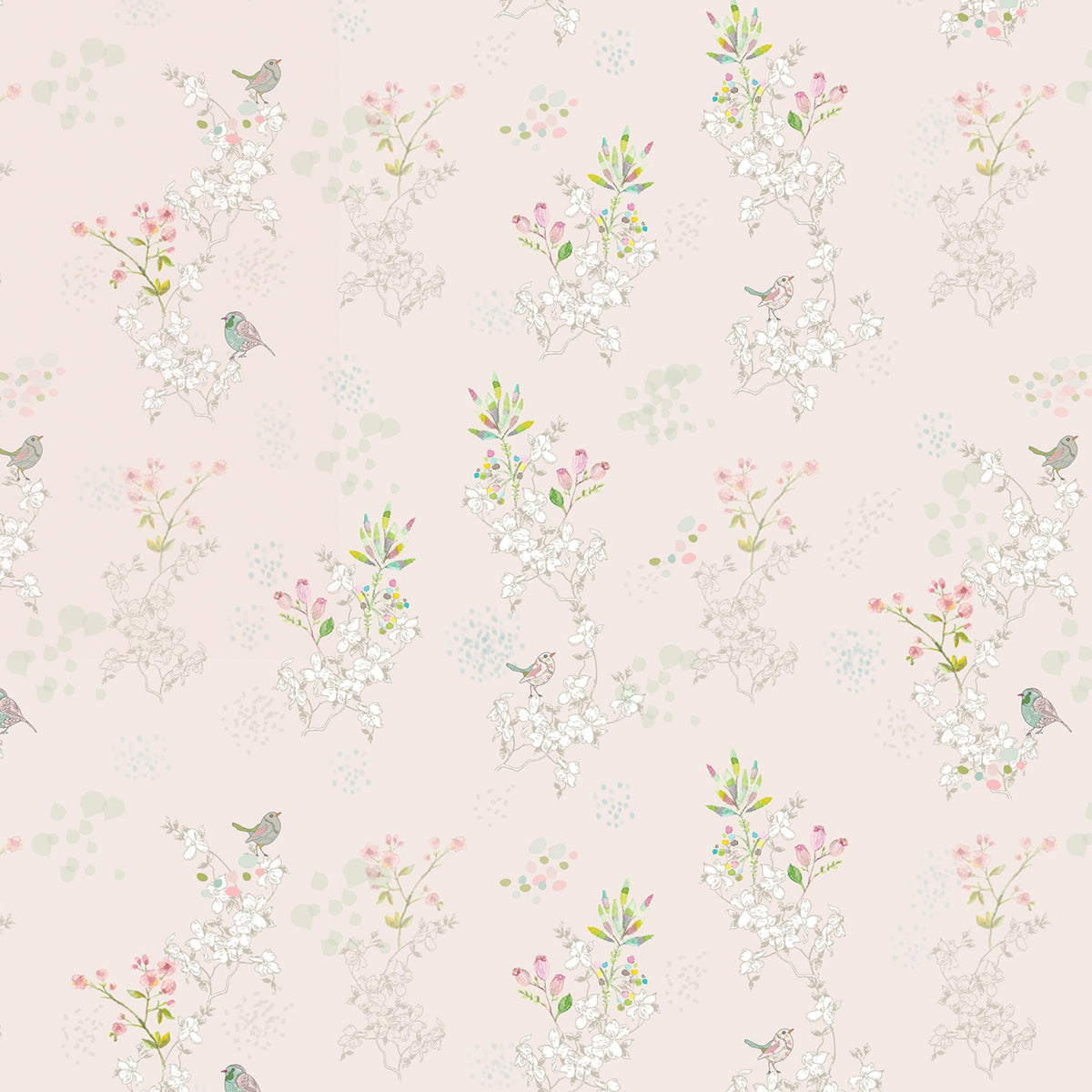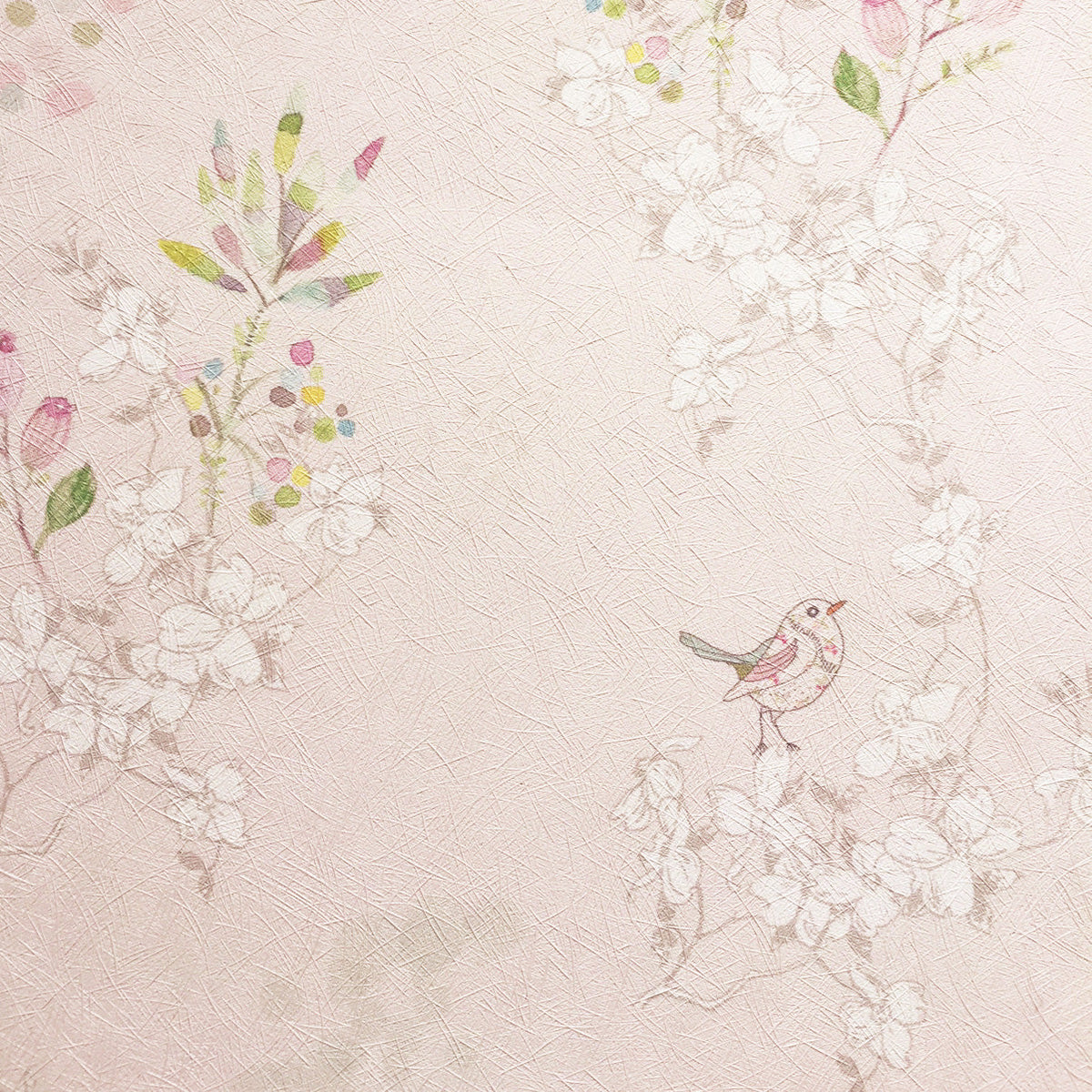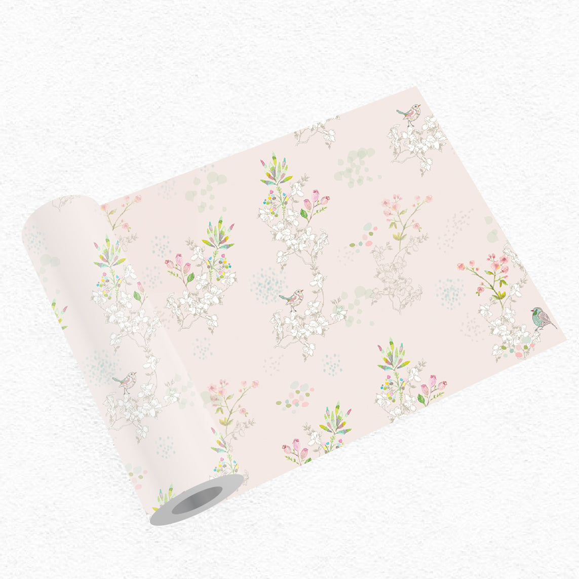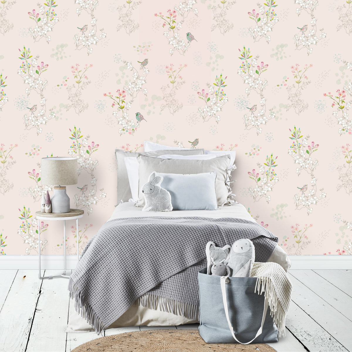 טפט קיר עדין עם איורים בסגנון יפני של ענפים וציפורים