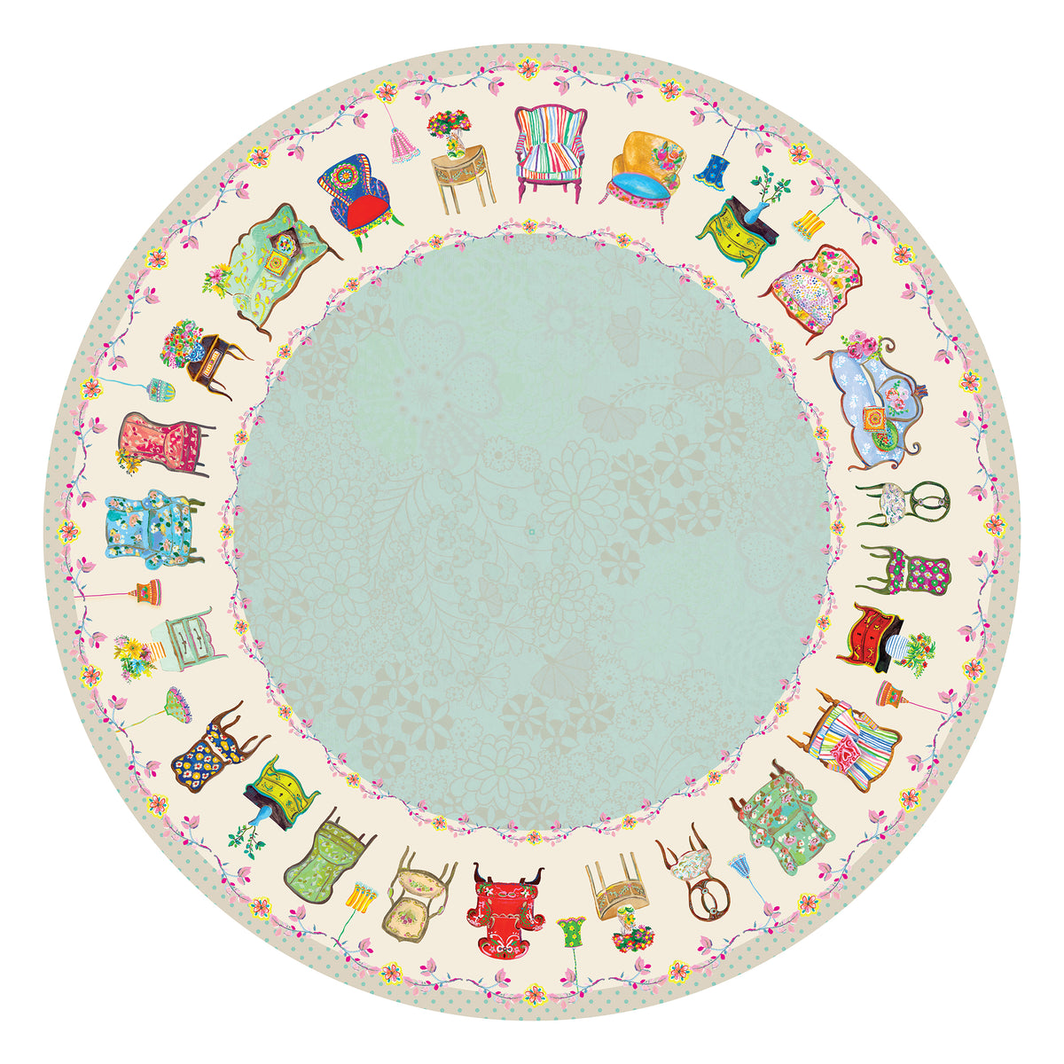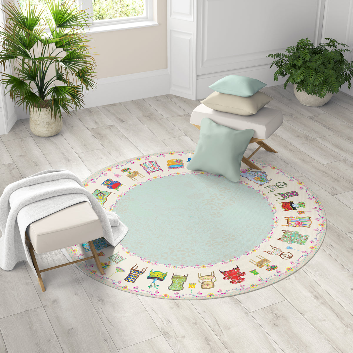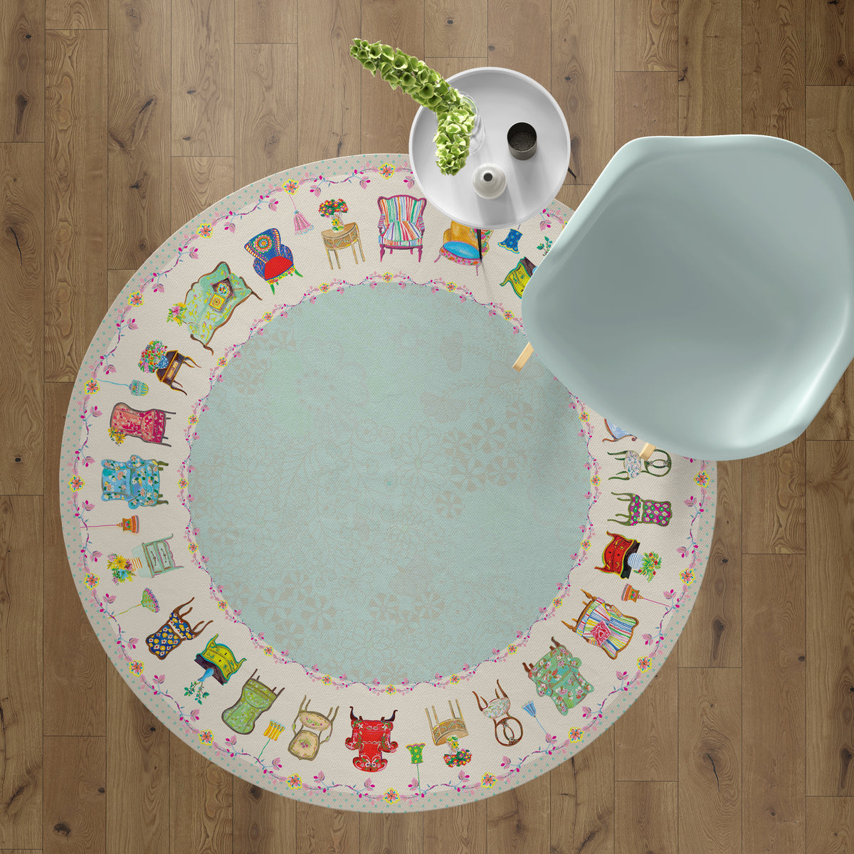 שטיח פיויסי עגול- כיסאות וינטג׳ שמנת תכלת