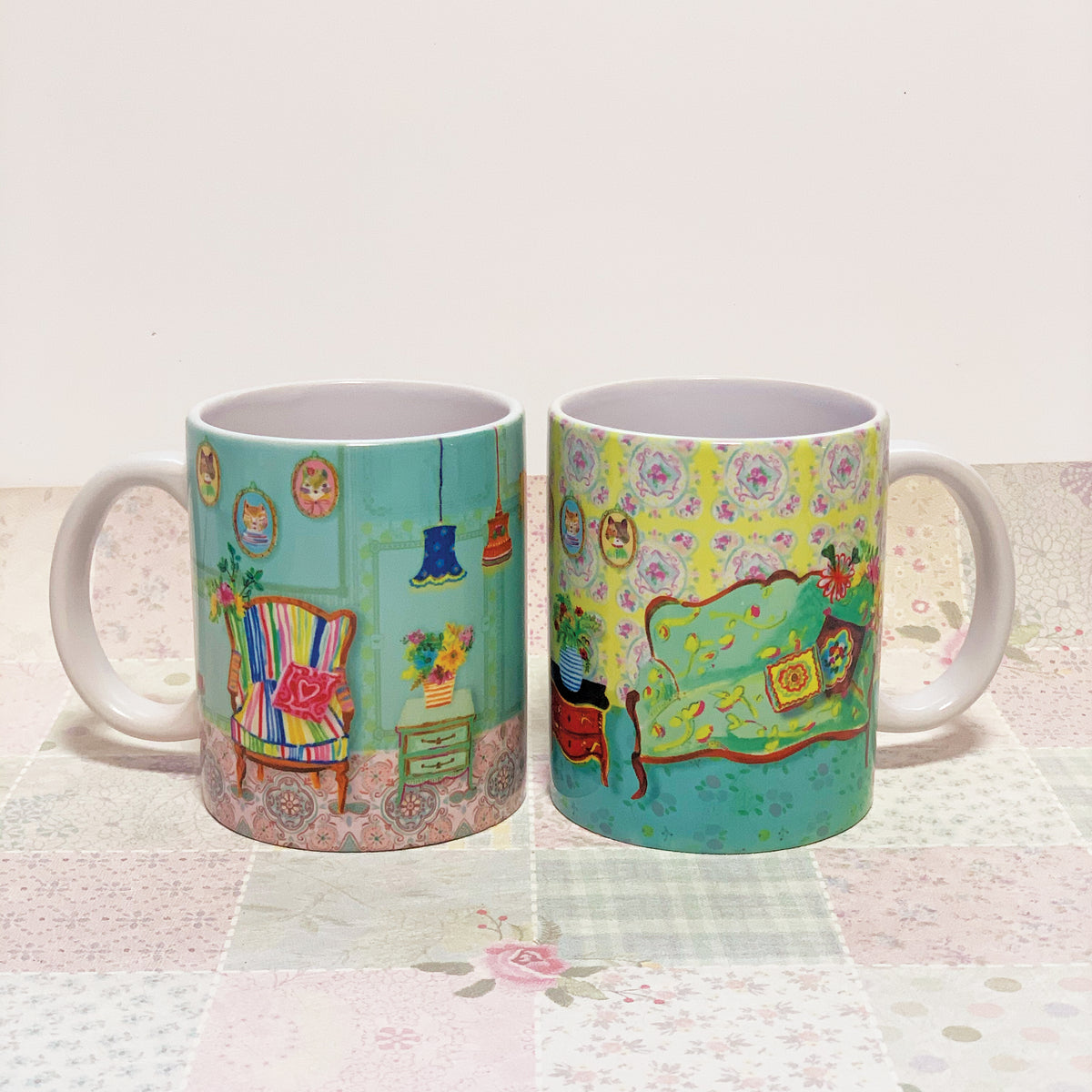 צמד ספלים מודפסים עם איורים צבעוניים של בית