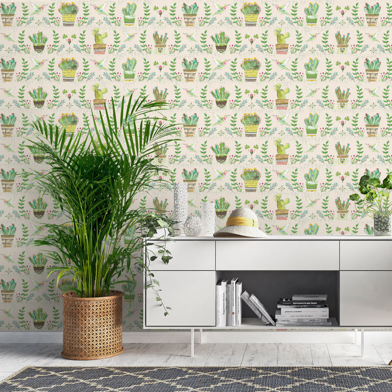 טפט קיר עם איורי עציצים- קרם