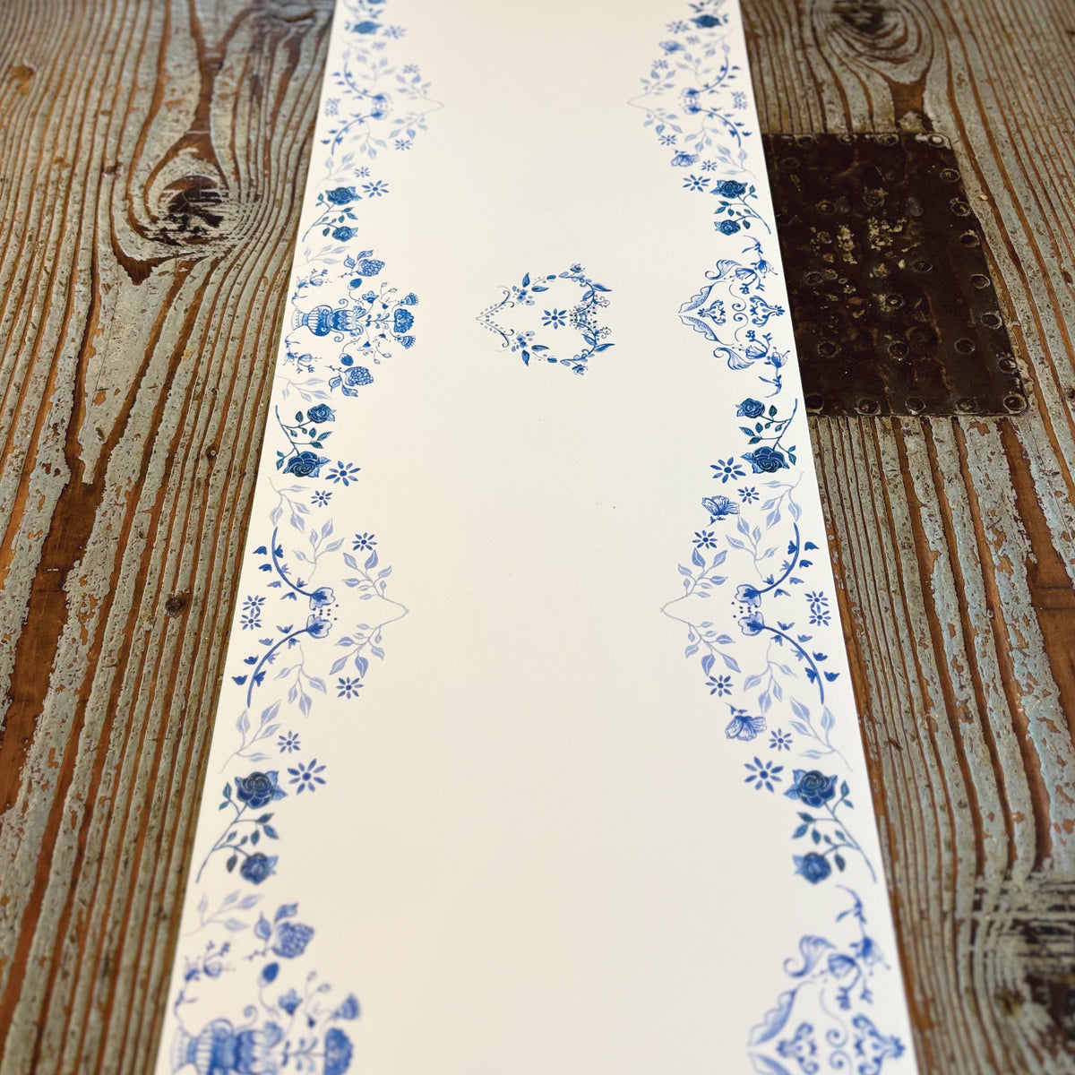ראנר לבן חגיגי עם איורי פרחים כחול לבן ולב באמצע