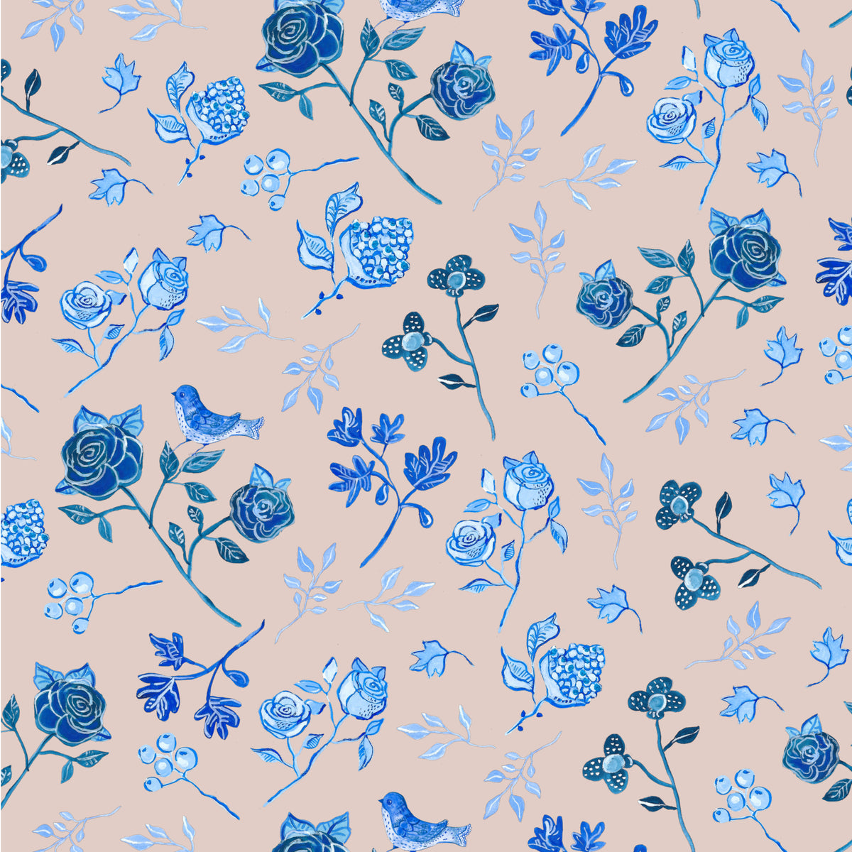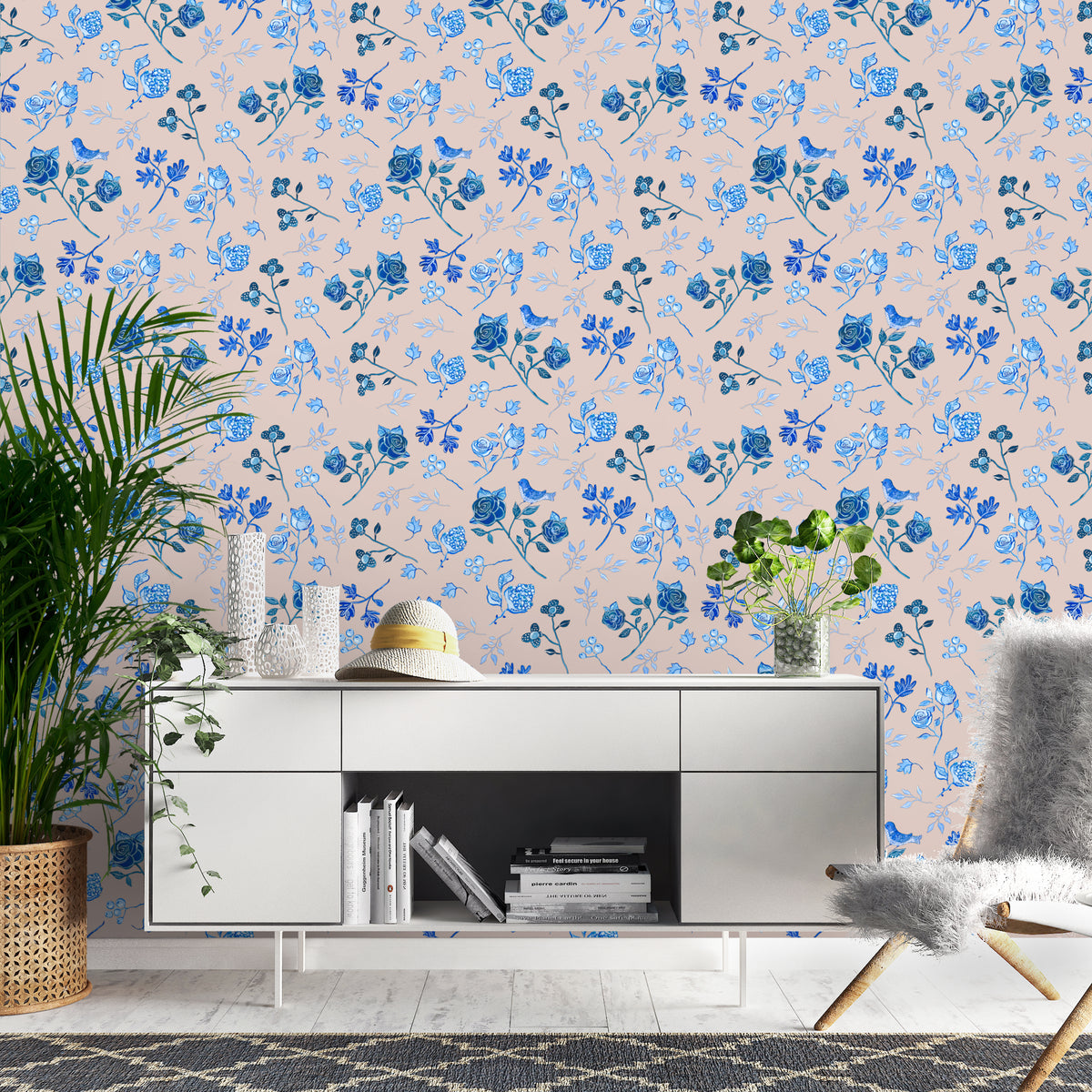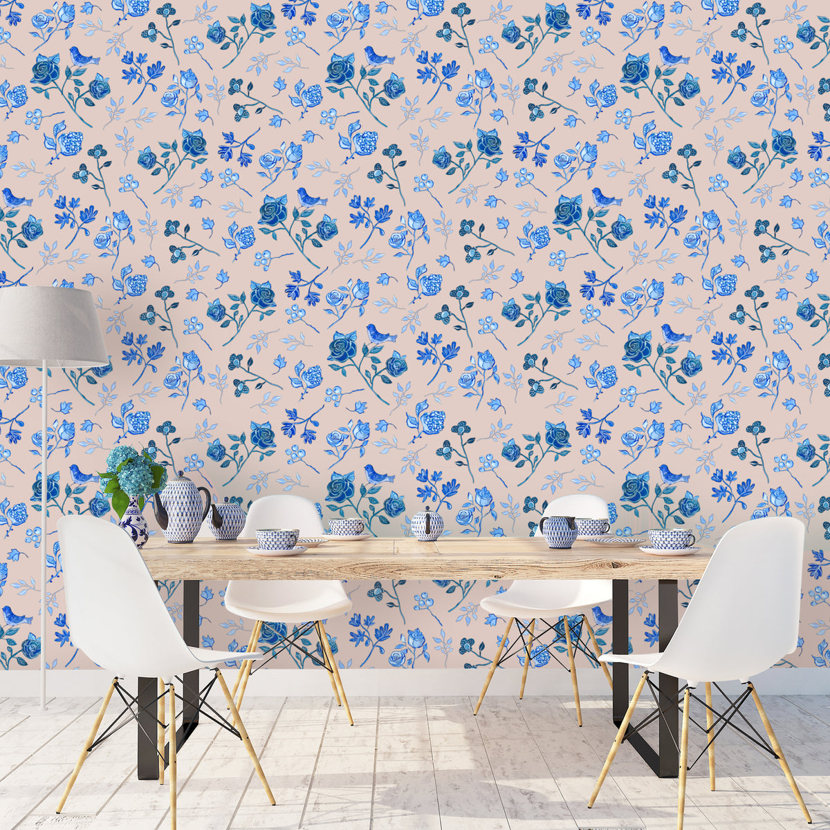 טפט פרחים כחול לבן- אורלי ורוד