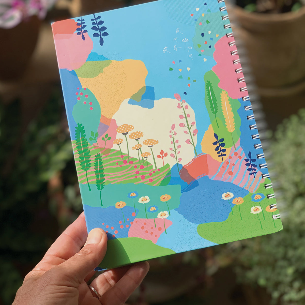 מחברת יפה עם איורי נופים צבעוניים, כריכה קשה.
