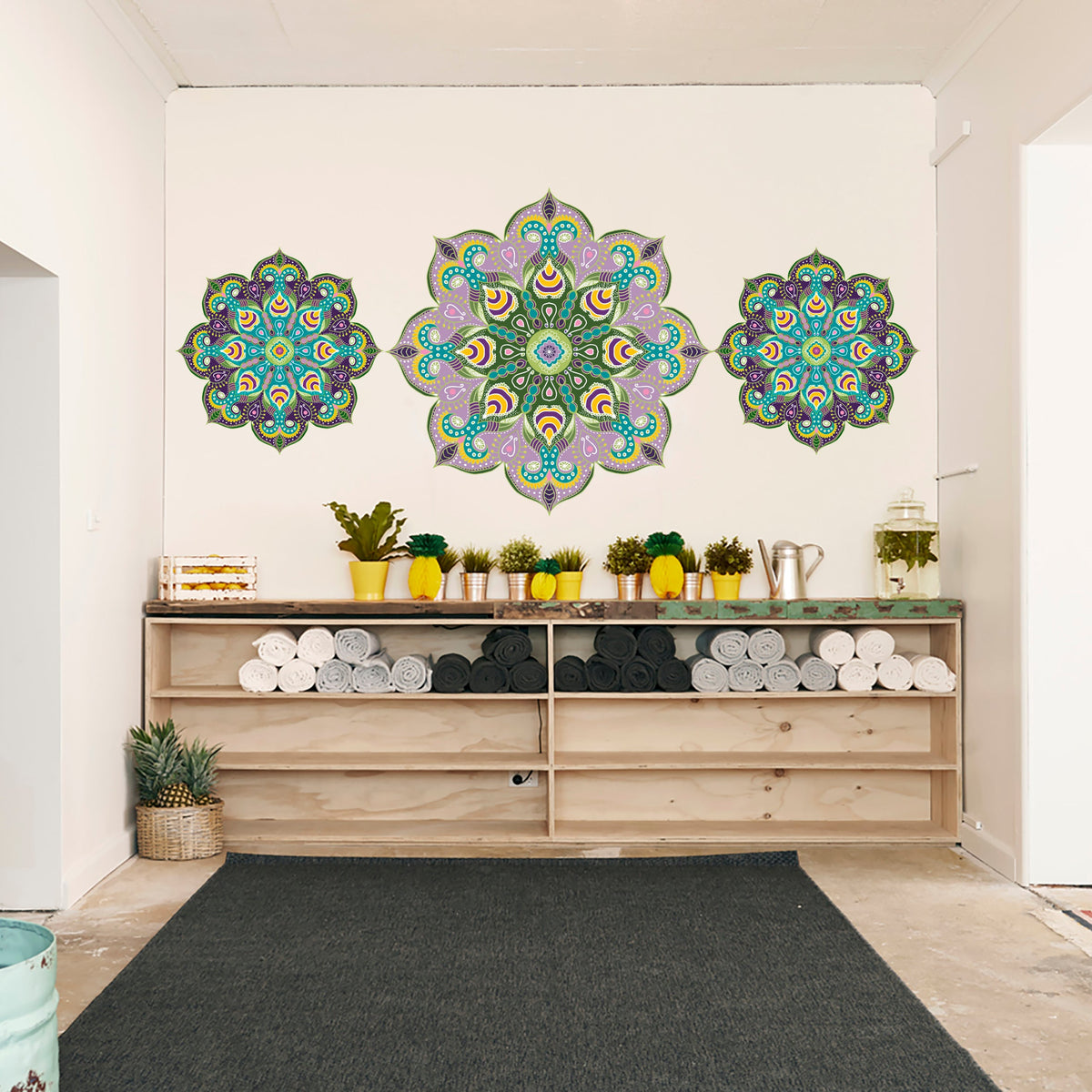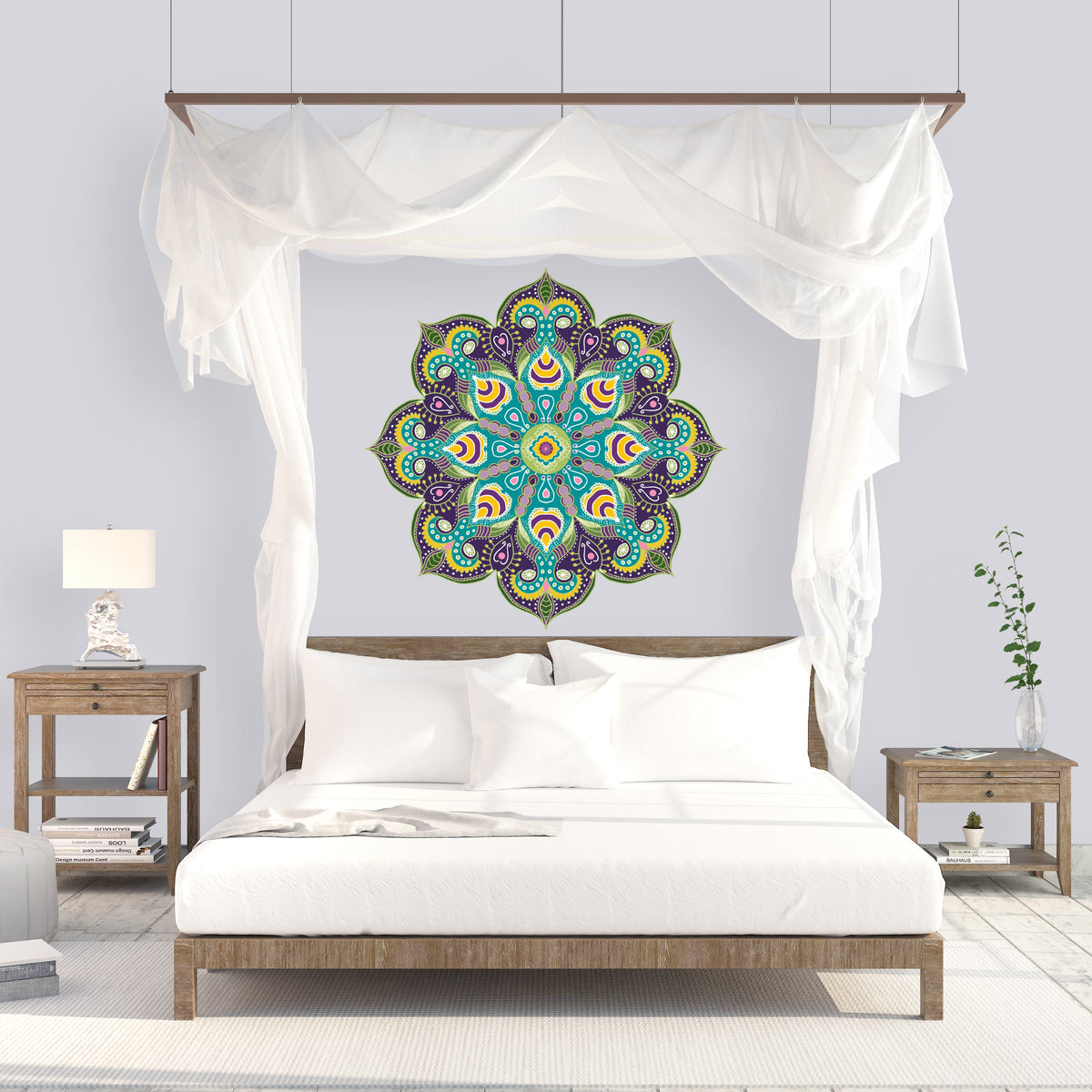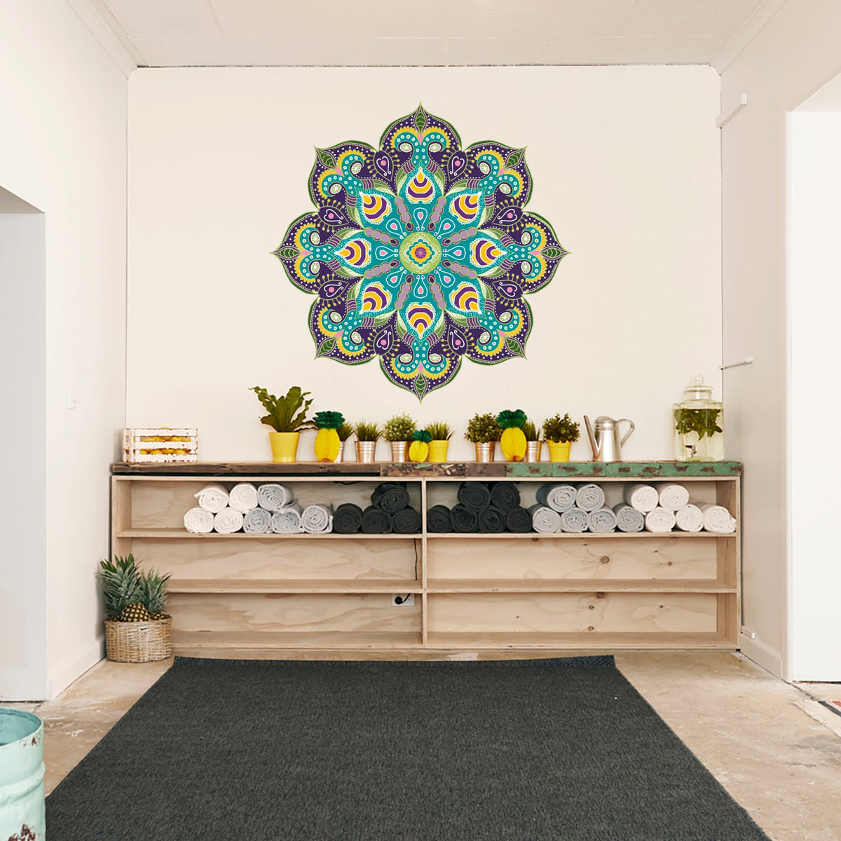 מנדלת קיר בגווני סגול חציל כהה, טורקיז וירוק