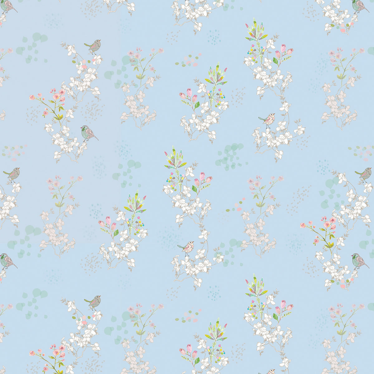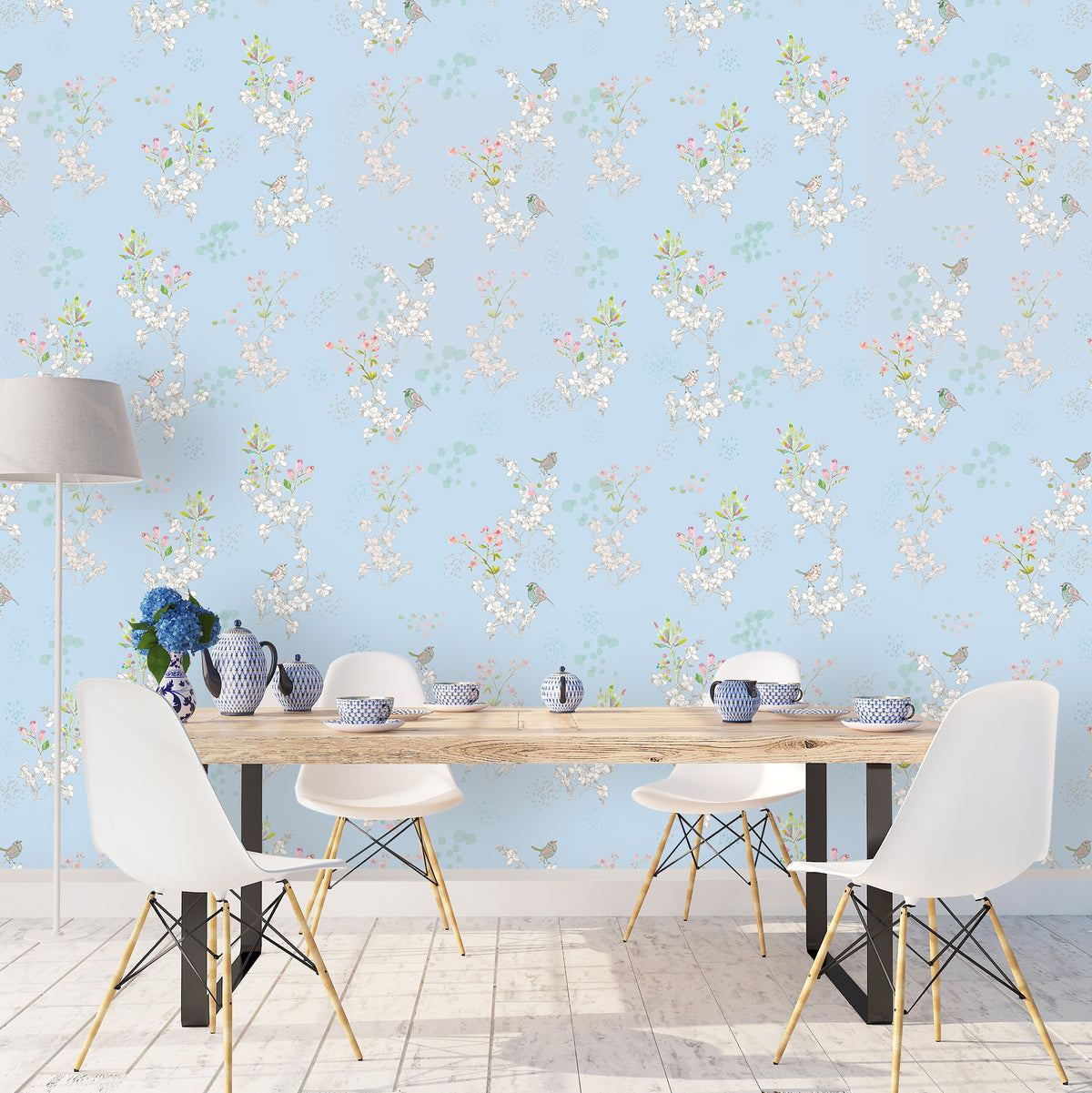 טפט קיר עדין עם איורים בסגנון יפני של ענפים וציפורים