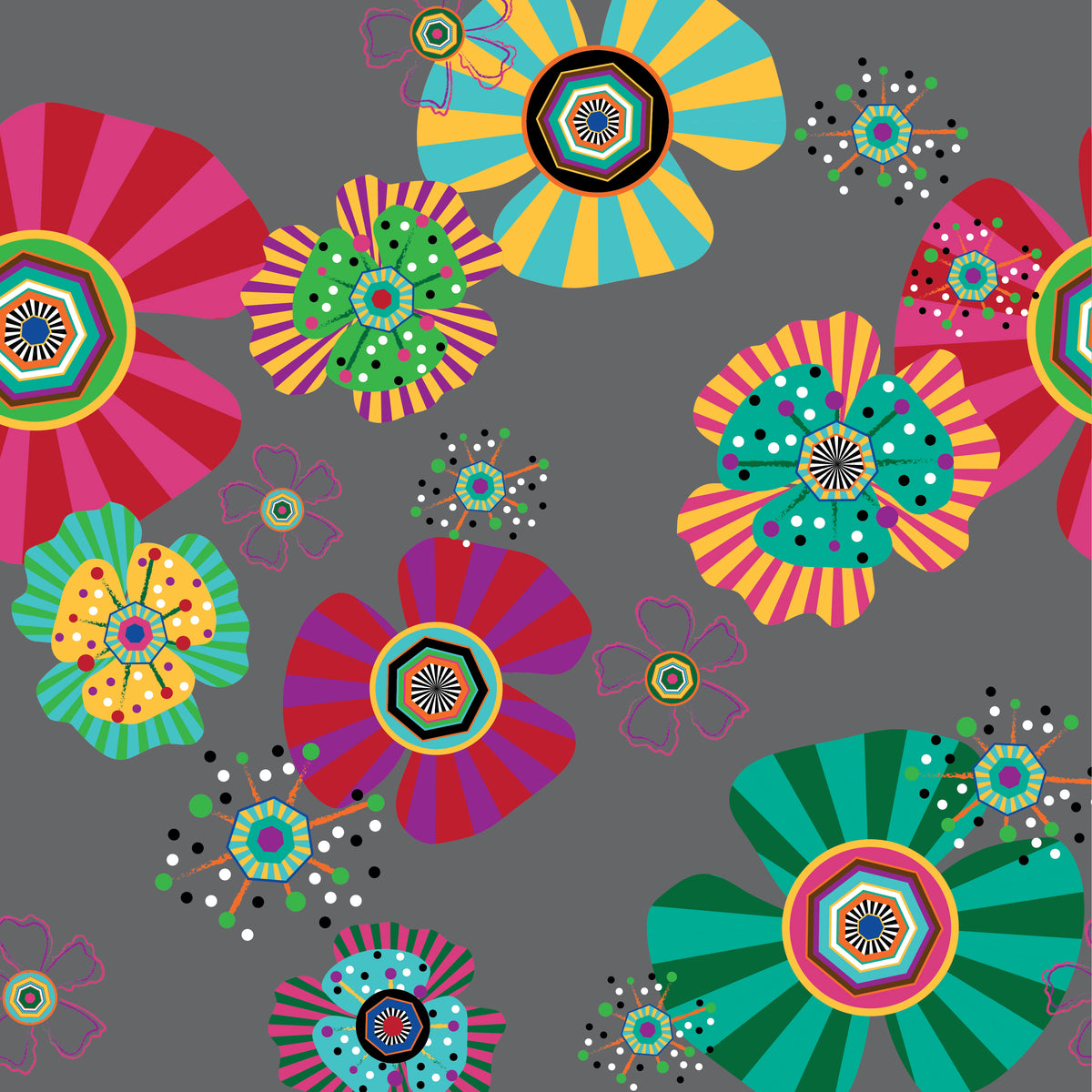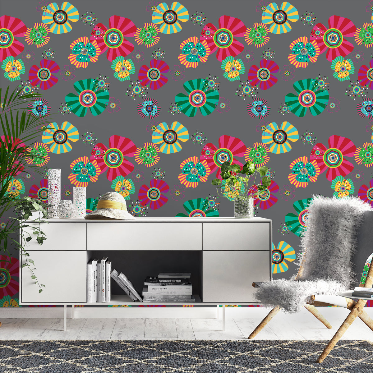 טפט קיר פרחים פסיכודלי אפור