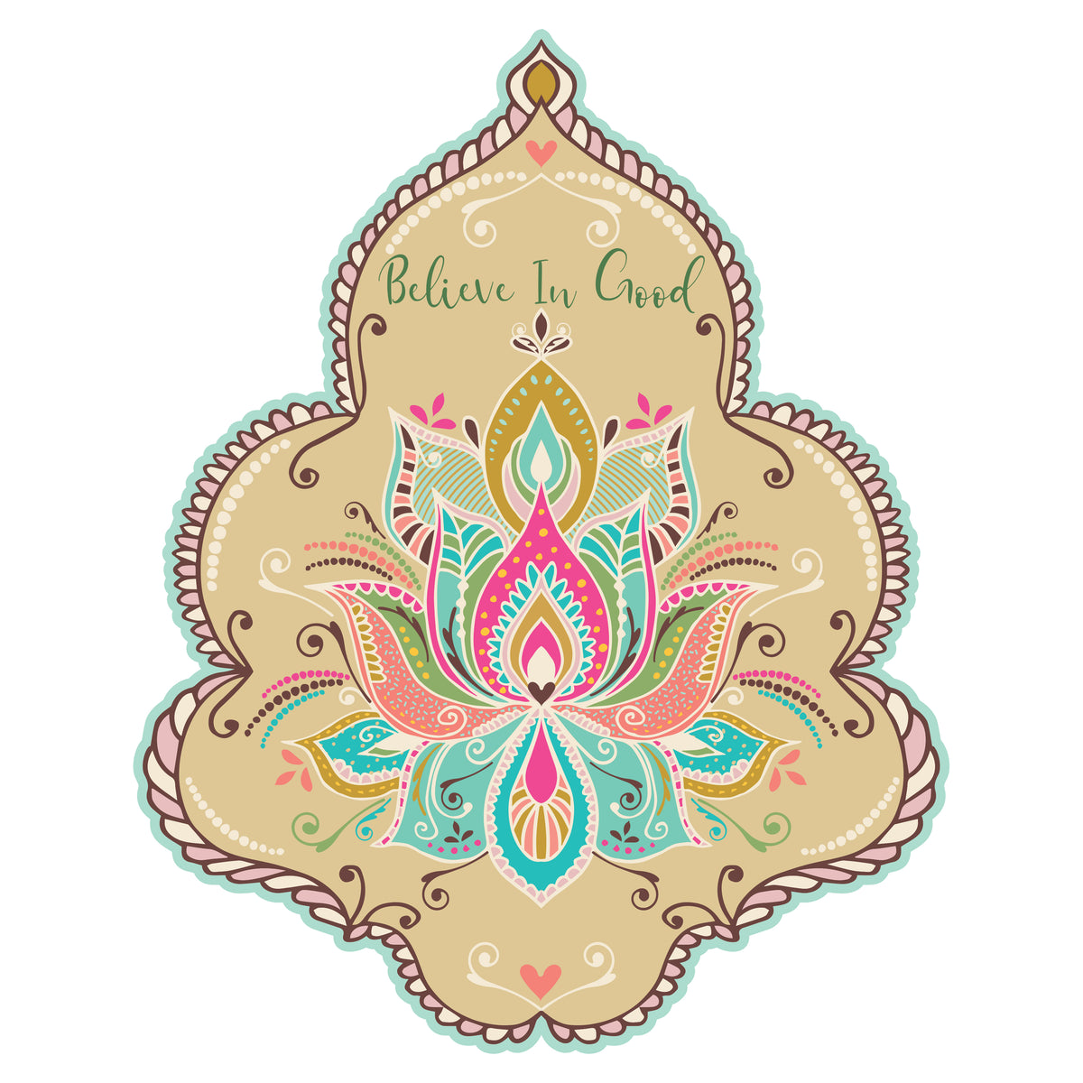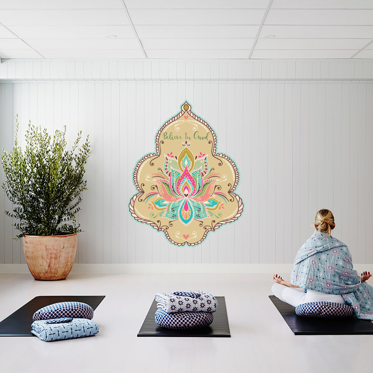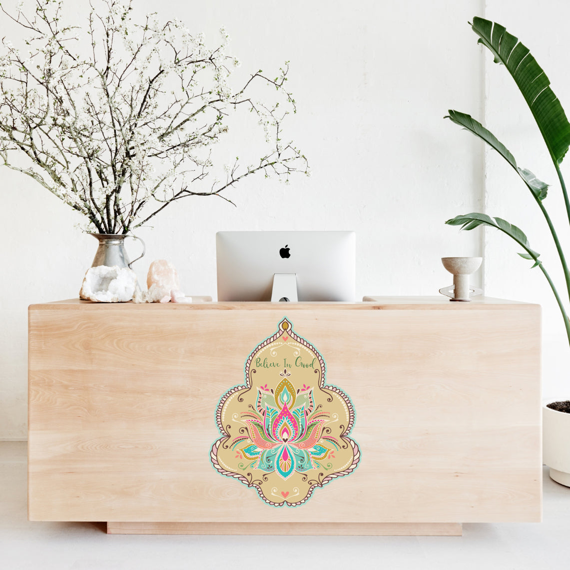 מנדלת קיר מעוטרת עם פרח לוטוס צבעוני וכיתוב believe in good