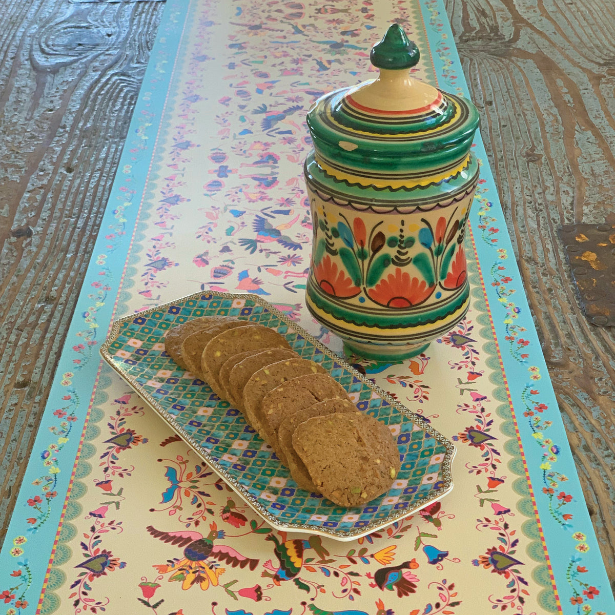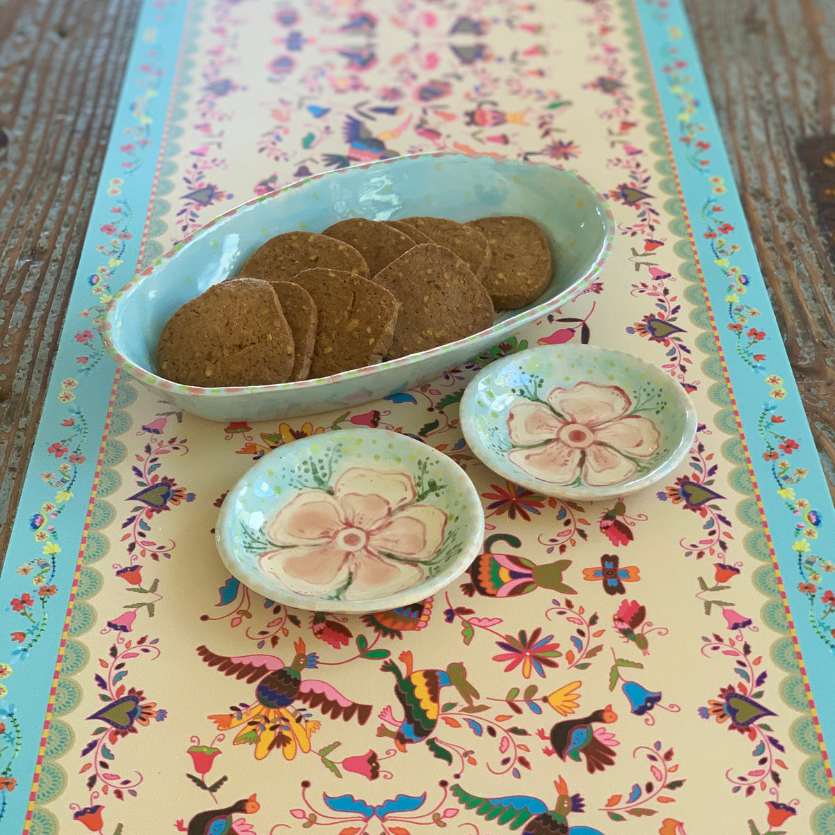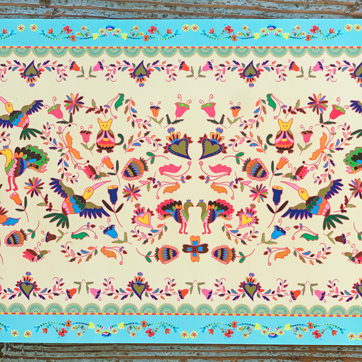 .ראנר עם איורים צבעוניים בהשראת רקמות מקסיקניות, על רקע קרם