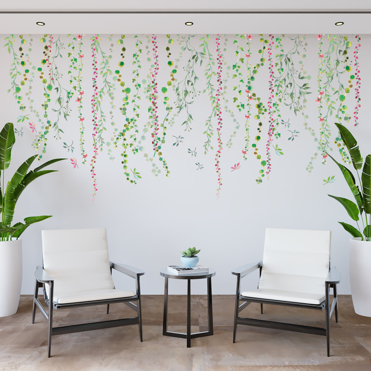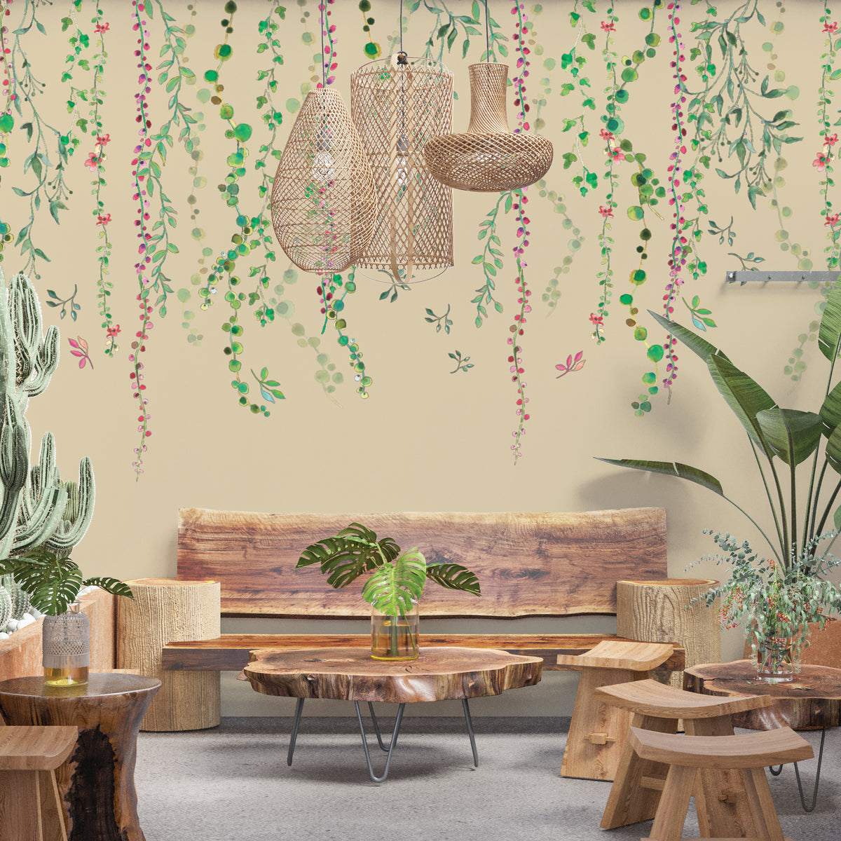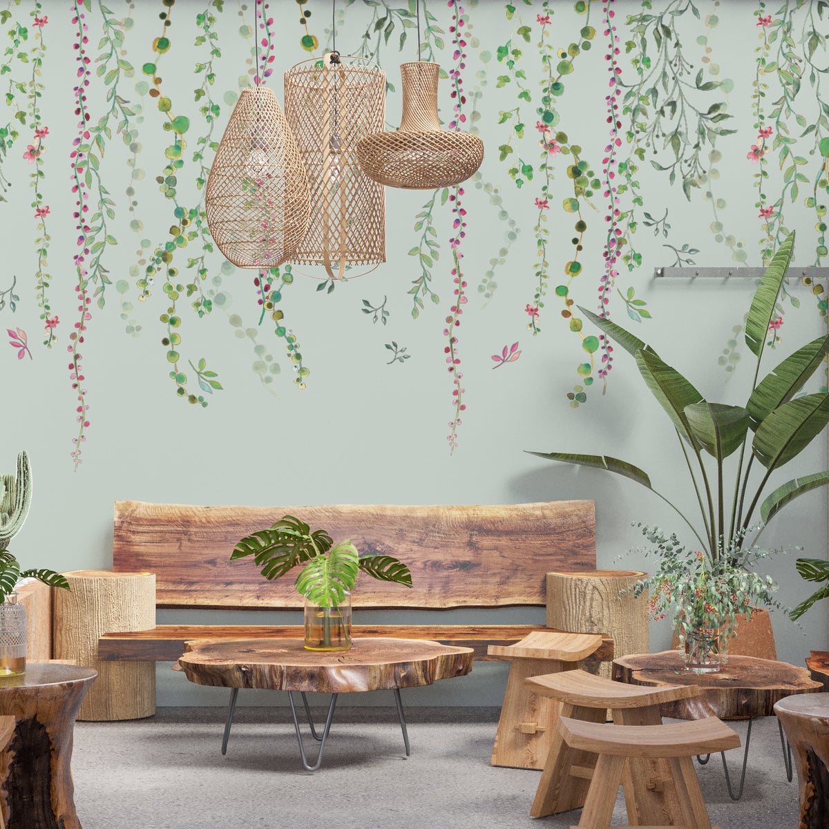 טפט קיר שיוצר אווירה, עם עלים ופרחים משתלשלים מהתקרה