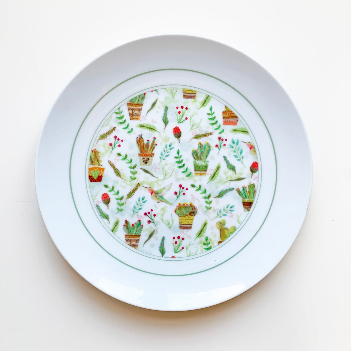 צלחת יפיפיה מודפסת עם ציורי עלים וקקטוסים