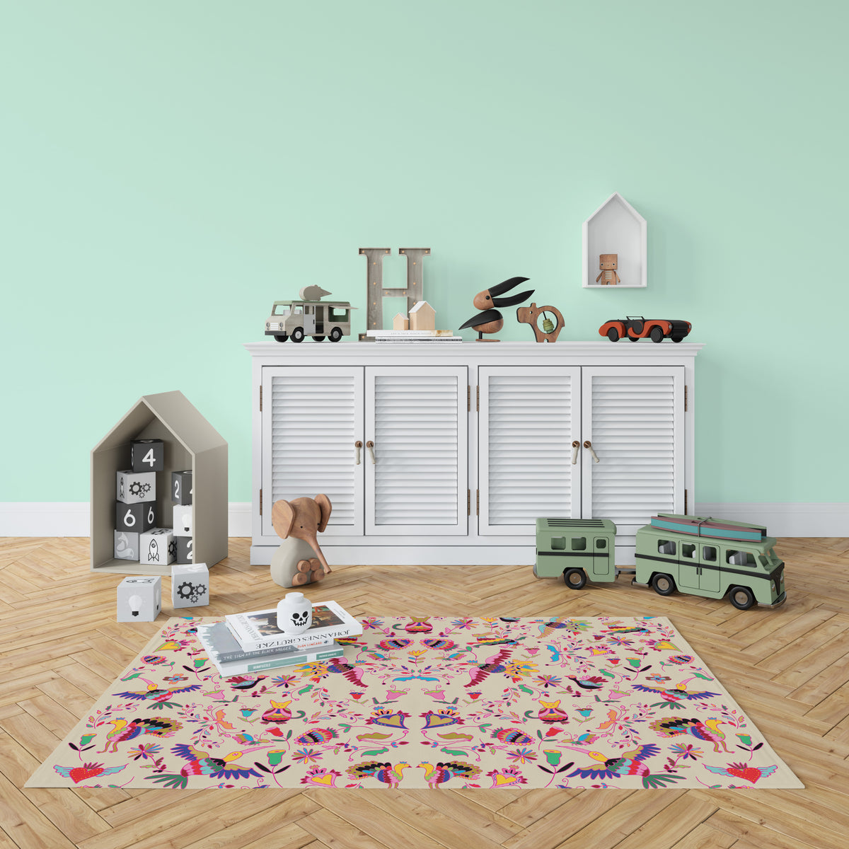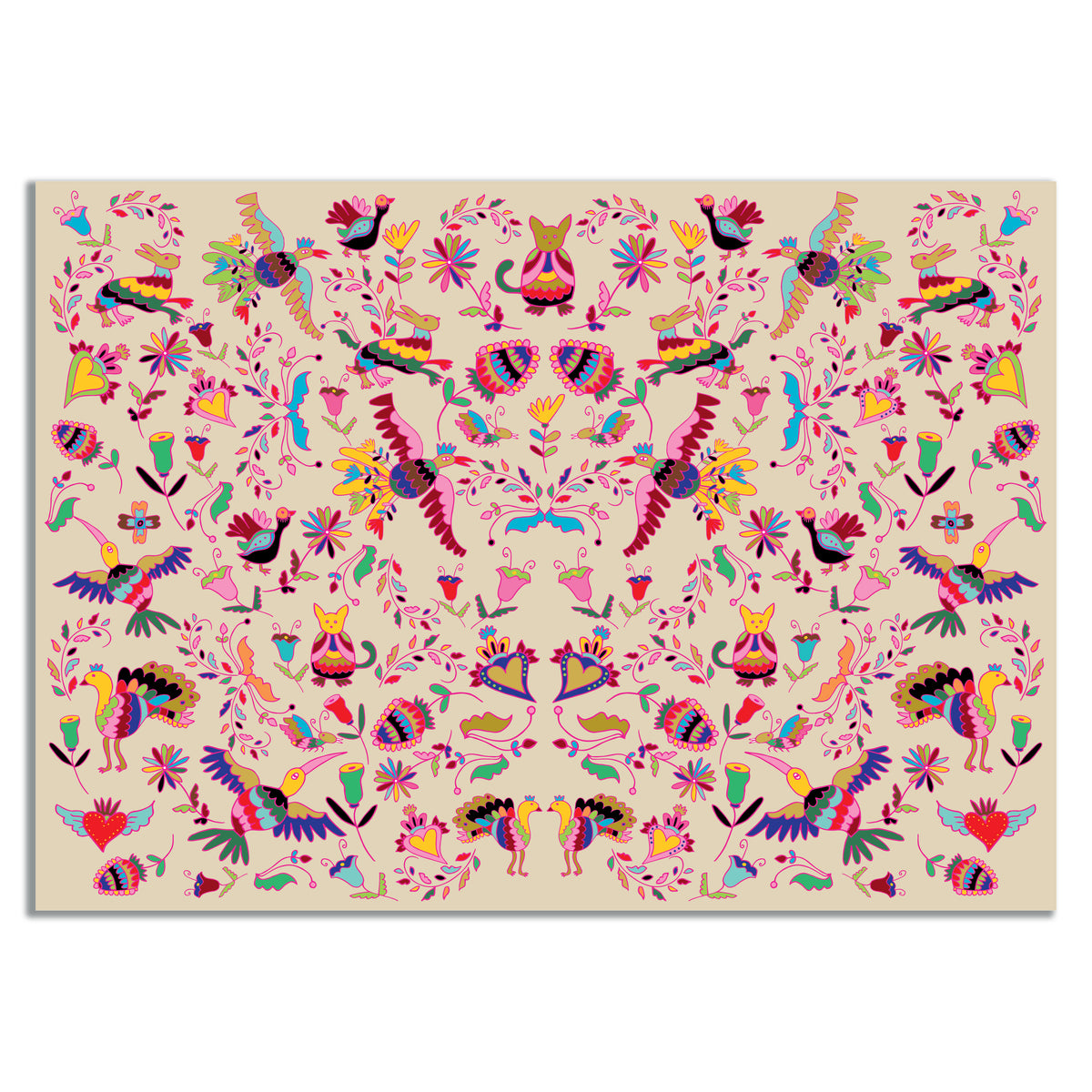 שטיח לינוליאום עם איורים בסגנון רקמות מקסיקניות, צבעוני ועשיר
