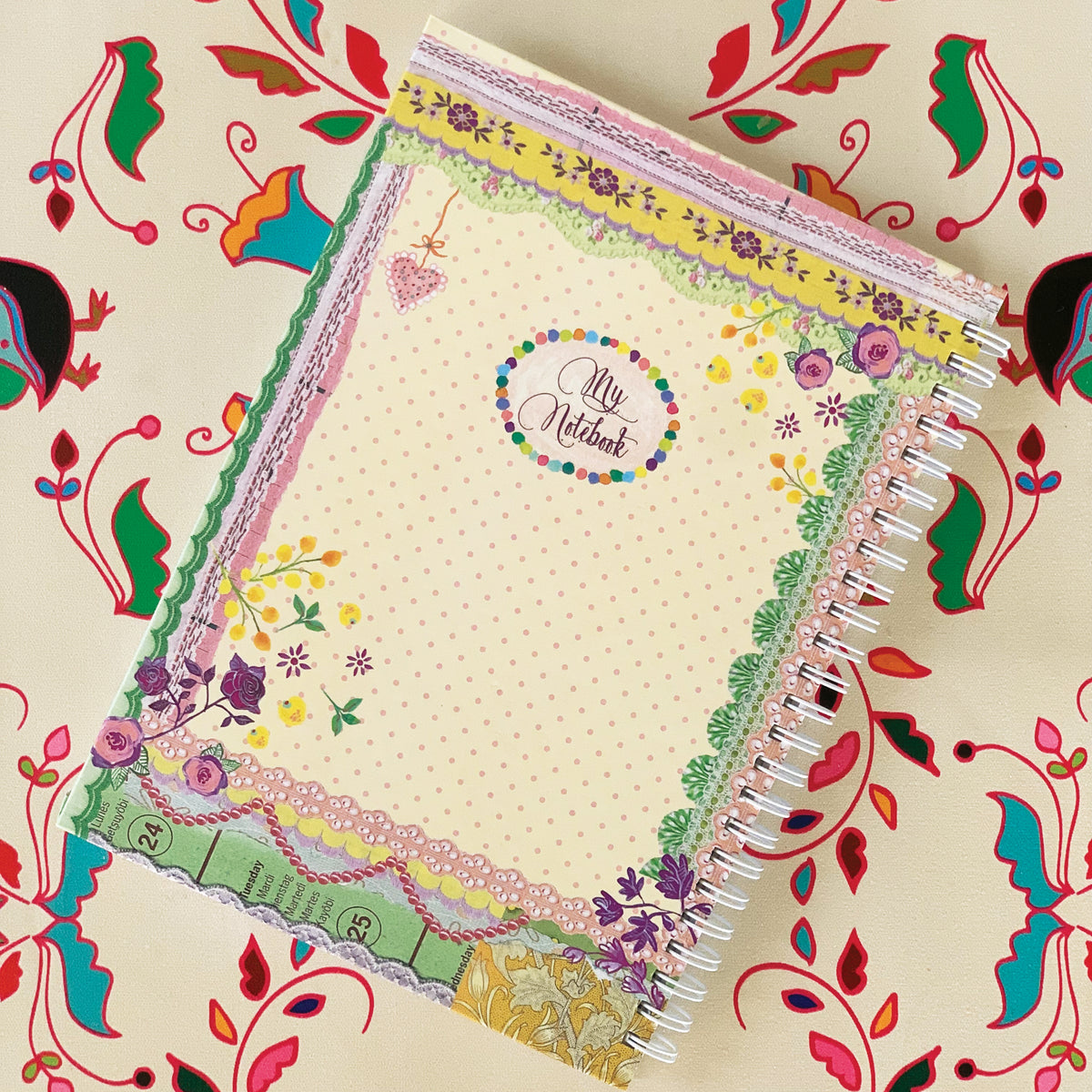 מחברת מיוחדת עם קולאז׳ ושילובי איורים, תחרות וטקסטורות, כריכה קשה.
