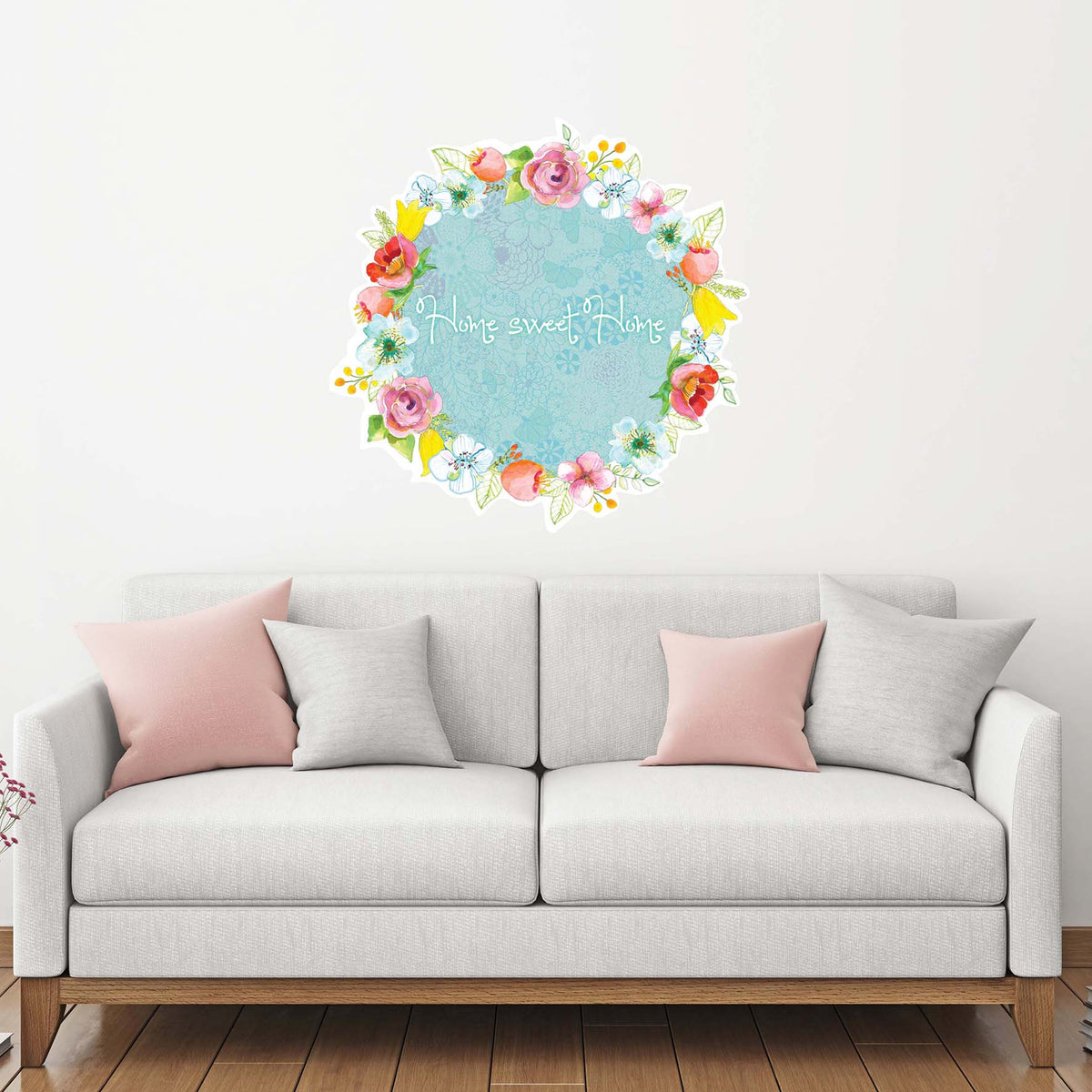 Home sweet home מדבקת קיר זר פרחים- תכלת
