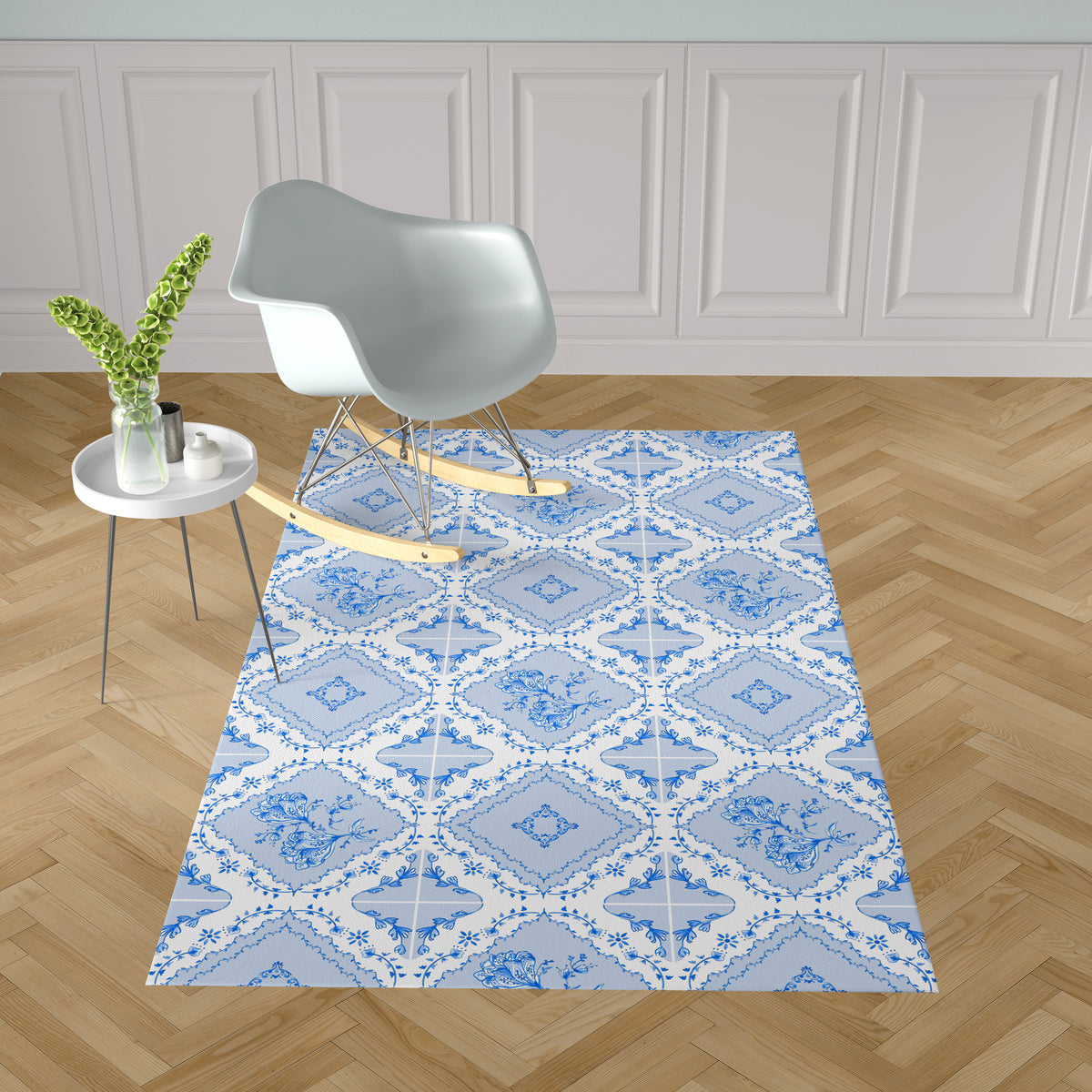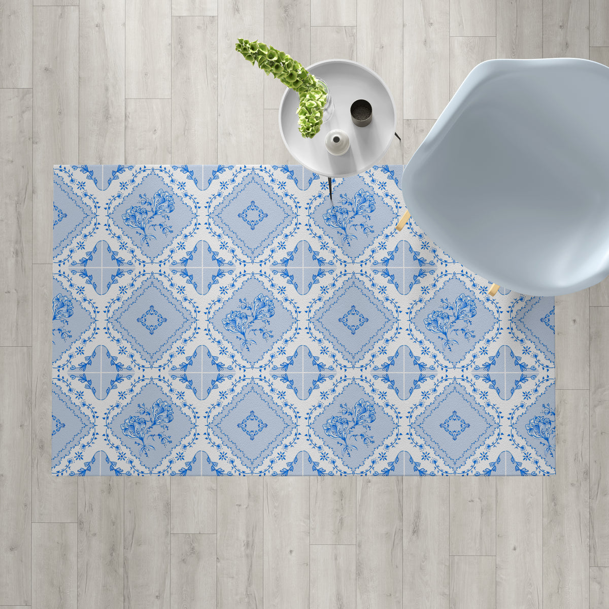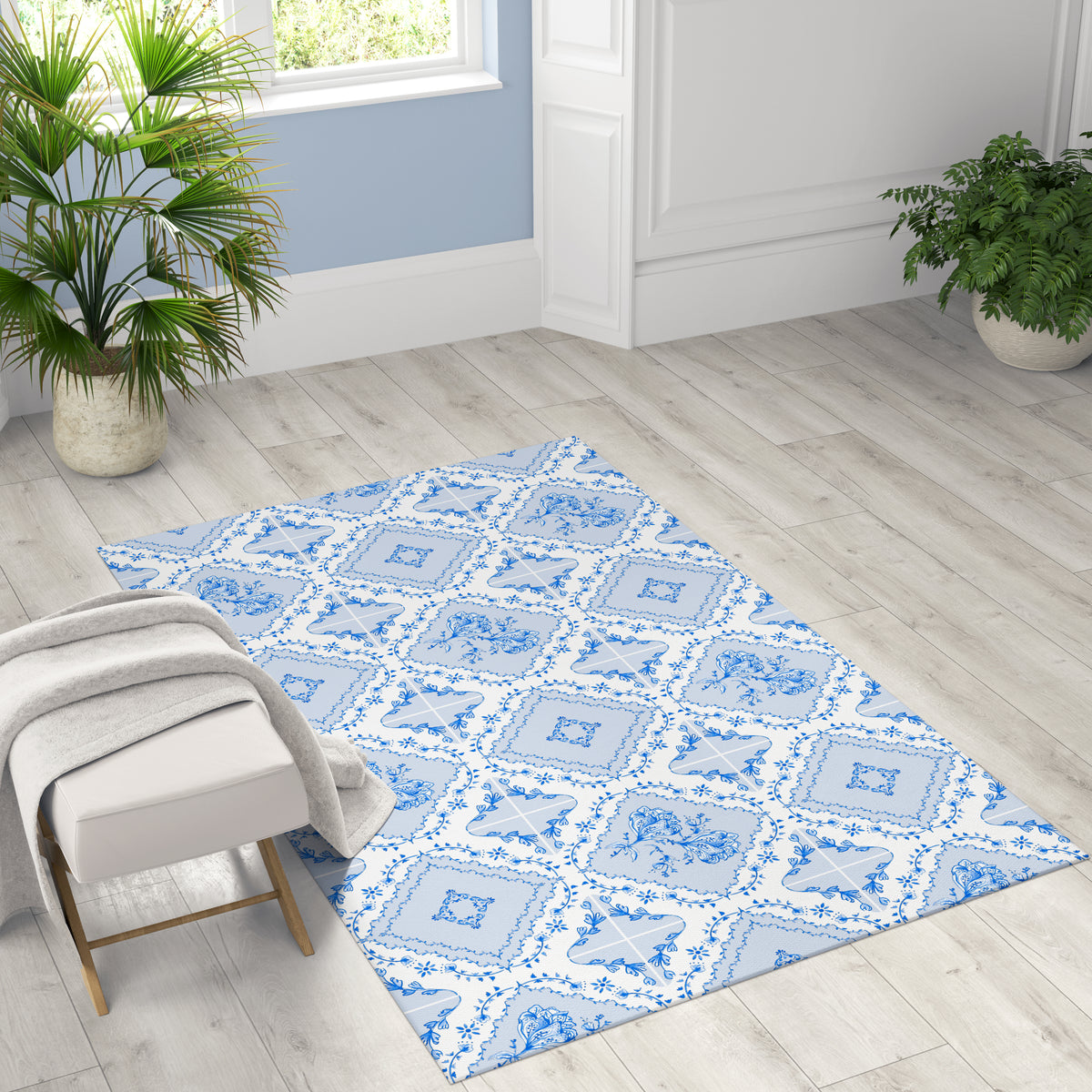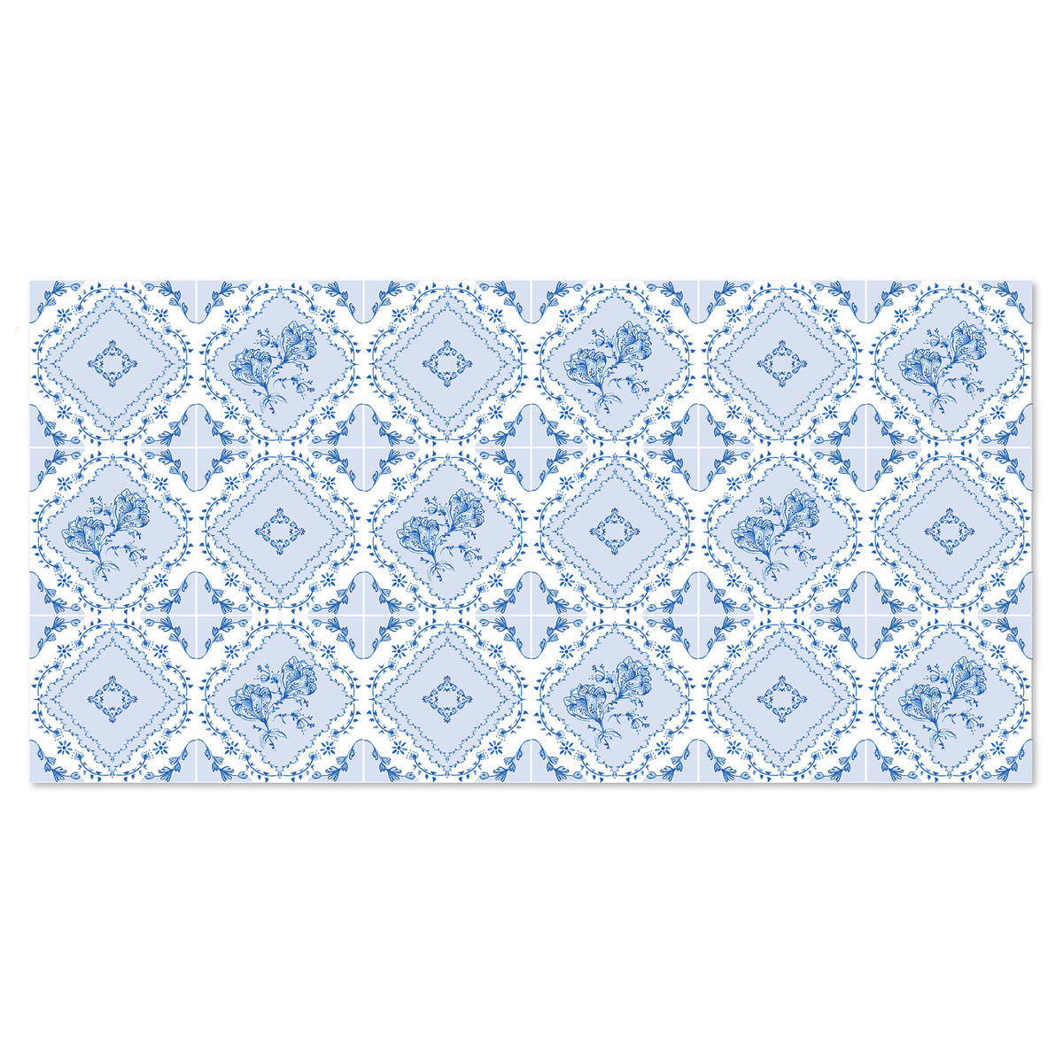 שטיח לינוליאום עם ציורי אריחים כחול לבן פרחוניים בסגנון פורטוגלי