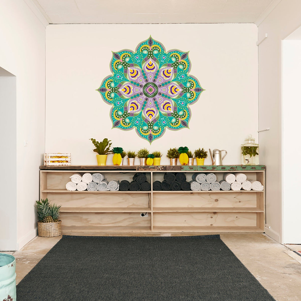 מנדלת קיר בגווני טורקיז, סגול וירוק